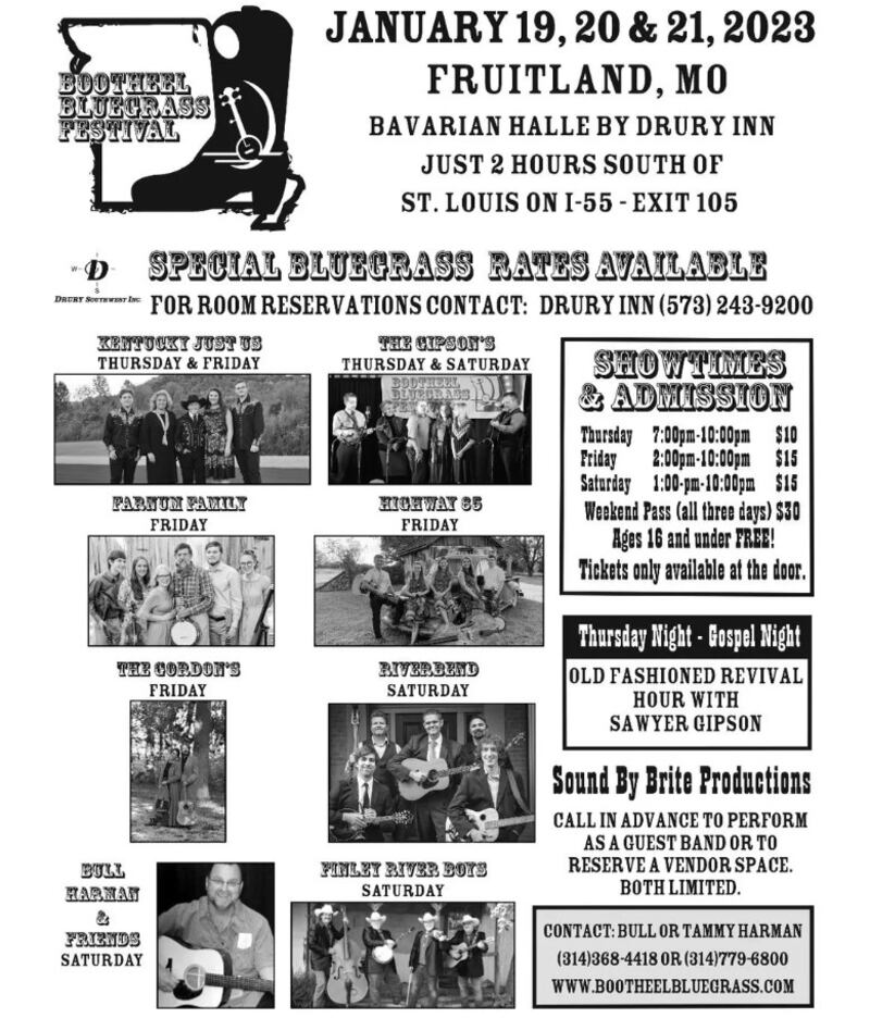 FRUITLAND, Mo. (KFVS) - The 2023 Bootheel Bluegrass Festival is coming to Fruitland and will be held again at the Bavarian Halle by Drury Inn.